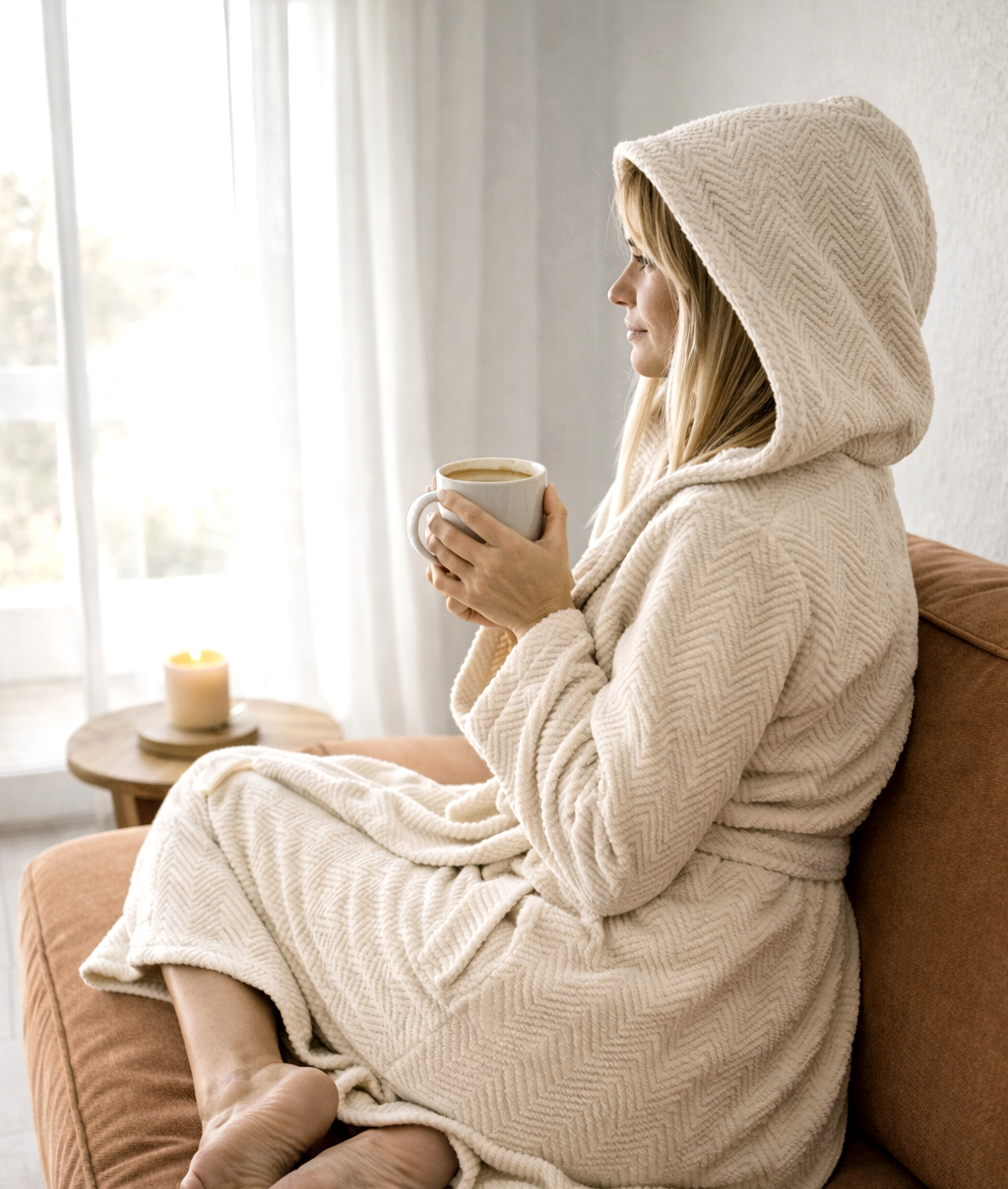 Der flauschige und bequeme Damenbademantel aus dieser Serie besticht dabei durch seinen einzigartigen Bauschzwirn, der das elegante Zick Zack Motiv in Hoch Tief Webung besonders zur Geltung bringt. Die seitlichen Eingrifftaschen, der feminine taillierte Schnitt sowie die Kapuze verleihen diesem Damenbademantel eine sowohl sportliche als auch klassische Note. Der Bademantel für Damen aus reiner Bio-Baumwolle ist bei 60°C maschinenwaschbar und trocknergeeignet und damit besonders pflegeleicht.